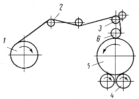1- разматываемый рулон; 2 - бумаговедущий вал; 3 - механизм продольной резки; 4 - несущий вал; 5 - наматываемый рулон; 6 – прижимной вал.