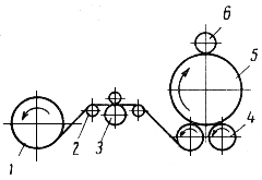 1- разматываемый рулон; 2 - бумаговедущий валик; 3 - механизм продольной резки; 4 - несущий вал; 5 - наматываемый рулон; 6 – прижимной вал.