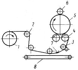 1- разматываемый рулон; 2 - бумаговедущий валик; 3 - механизм продольной резки; 4 - несущий вал; 5 - наматываемый рулон; 6 – прижимной вал; 7 – расправочная дуга; 8 – транспортер для заправки бумаги.