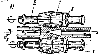 Поперечно-винтовая (косая) прокатка широко применяется при производстве бесшовных труб из сплошной заготовки (рис. 135, б). Валки 1 вращаются в одном направлении, а оси их расположены под некоторым углом, поэтому заготовка 2 при обработке не только вращается (υ>y>), но также и перемещается вдоль своей оси(υ>x>). Для получения правильной формы и гладкой поверхности отверстия трубы (гильзы) в зоне образования отверстия устанавливается оправка 3. Полученные на прошивном стане гильзы раскатываются на трубопрокатных станах. Метод поперечно-винтовой прокатки применяют также для производства шаров, осей и других изделий с использованием специально калиброванных валков. Сталь для горячей прокатки нагревают до температуры выше линии 68К (см. рис. 132); медь, алюминий и их сплавы также прокатывают в горячем состоянии. Из горячекатаной заготовки (лист толщиной 1,25 мм) холодной прокаткой получают тонкие изделия (до 0,1 мм и меньше), ленты для пружин, листы, фольгу и прочее.
