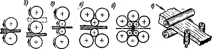 Прокатка заготовок на трехвалковых станах (рис. 136, б) ведется в одну сторону между нижним и средним валками, в другую – между средним и верхним; направление вращения валков постоянное. В четырех- и шестивалковых станках (рис. 136, в, г) верхние и нижние валки являются опорными, они препятствуют прогибу средних рабочих валков; эта схема применяется для листовых станов.