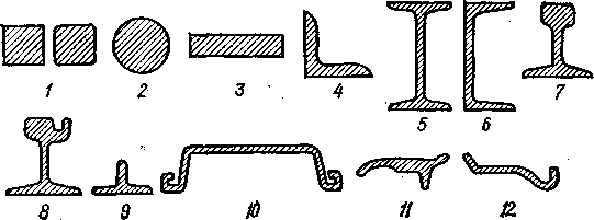 В зависимости от вида прокат делят на сортовой, листовой, трубный, периодический и специальный. На рис. 133 приведены виды сортового проката общего назначения: 1 — квадратный; 2 — круглый; 3 — полосовой; 4 — угловой; 5 — двутавровый; 6 — швеллерный; 9 — тавровый и некоторые виды сортового проката специального назначения — 7 и 8 — рельсовый; 10 — шпунтовый; 11 — полоса для башмаков гусениц тракторов; 12 — полоса для ободьев колес автомобилей.