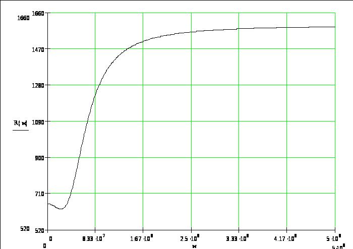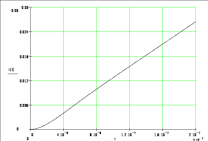 Поскольку данный график содержит ось времени от 0 до t1, да плюс, как мы увидели по переходной характеристике, затухание происходит очень быстро, увидеть в таком масштабе колебания нельзя. На рисунке 3.8 ось времени содержит значения от 0 и до 2*10^-7 секунд, на этом графике хоть и слабо, но все же видно, что нарастание вначале нелинейное.
