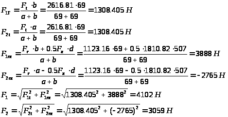 Радиальные реакции в опорах вала находим в двух взаимно перпендикулярных плоскостях. Составляющие радиальных реакций в направлениях окружной и радиальной сил на каждой из опор вала будут равны: