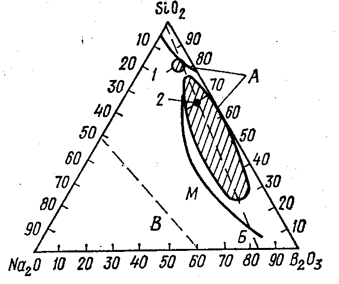 Щелочно-боросиликатные стекла являются одним из примеров того, что при микронеоднородном строении может наступить фазовое разделение, сопровождающееся образованием границ раздела фаз. При выщелачивании стекол в области составов, отмеченных на рис. 2.1, растворами соляной, уксусной и других кислот образуется высокопористый кремнеземистый каркас (95—96 % SiO>2>), сохраняющий исходную форму, размеры и прочность (кварцоидные стекла, викор). Средний диаметр пор, в которых располагается натриево-боратная фаза, составляет 2—6 нм.