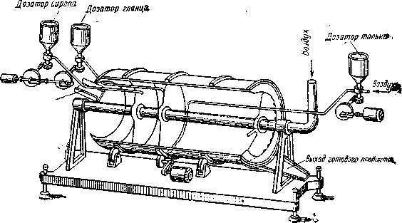 При непрерывном способе обсыпки карамели сахаром используют те же аппараты, что и для глянцевания, но угол наклона увеличивают. Этим достигается более быстрое прохождение карамели через аппарат. Продолжительность обсыпки в непрерывно действующем аппарате составляет всего 5 мин. Кроме того, первая перегородка в аппарате поднимается. В аппарате остается только две секции. Охлажденная карамель поступает в первую секцию, туда же непрерывно дозатором подается сахарный сироп влажностью 25—26% и температурой 80—85°С. Сахарный песок ковшовым элеватором подается во вторую секцию. В эту же секцию поступает воздух, но в меньшем количестве, чем при глянцевании.