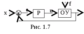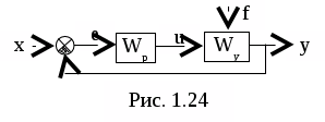 x - задающее воздействие (задание), e = х - у - ошибка регулирования, u - управляющее воздействие, f - возмущающее воздействие (возмущение).