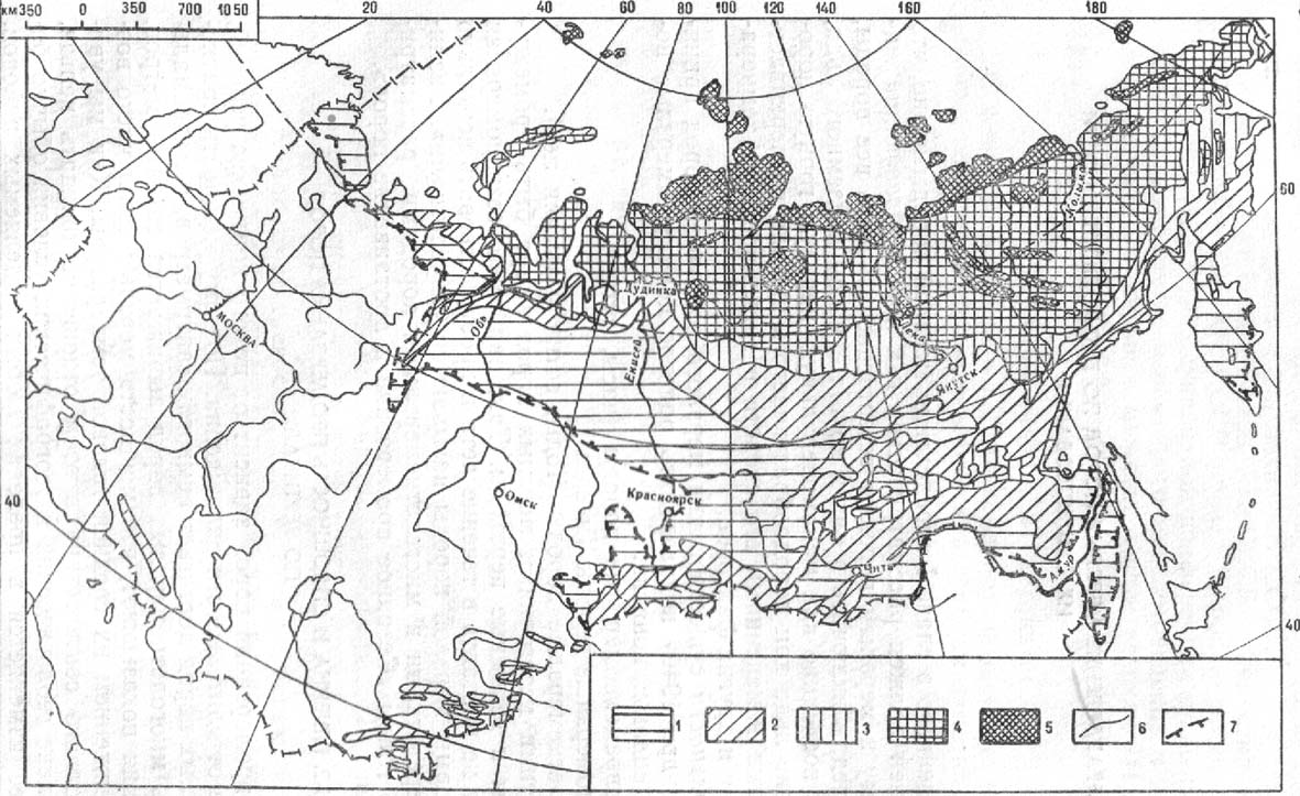 1-Зона редкоостровного и массивно-островного распространения ММП со среднегодовыми температурами(tср) от +3 до –1С и мощностью мёрзлой толщи(М) от 0 до 100 м;2-5 зона сплошного распространения ММП: 2- t>ср> от –1 до –3, М от 50 до 300 м; 3- tср от –5 до –9 Ю, М от 200 до 600 м; 5- t>ср > от ниже -9С, М от 400 до 900 м и более ;6- граница зон ММП;7 южная граница криолитозоны