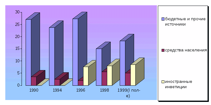 В общем объеме капитальных вложений увеличивается удельный вес средств предприятий и организаций. В 1999 г. этот показатель составил 22,8%. Банковские кредиты возросли с 10% в 1995 г. до 28,6% в 1999 г., а средства населения соответственно с 6,5% до 22,8 %.
