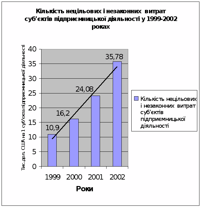 Згідно вищезазначених даних було побудовано графік і за допомогою лінії тренду зроблено прогноз щодо незаконних витрат на одного суб’єкта підприємницької діяльності на 2002 рік, за умов, якщо тенденція до зростання не зміниться. Прогнозне значення складає приблизно 35,78 тис.дол. США. (дод. Б)