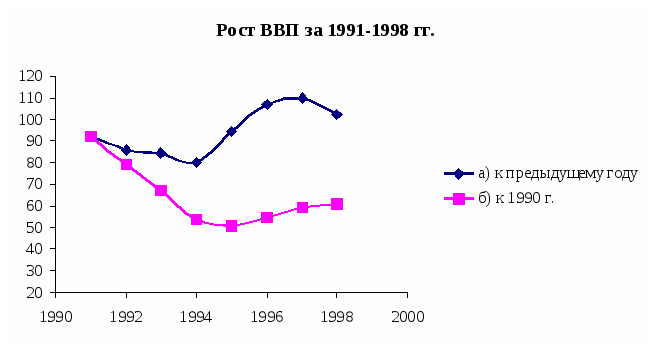 Если говорить о состоянии реальной экономики (производства), то 1991-1995 гг. действительно оказались годами ее разрушения, а 1996-1998, за редкими исключением, стали годами использования того, что сохранено и не сломано. 1996-1998 гг. остались годами стагнации, хотя статистика (таблица 1) говорит о росте в целом. Наблюдающийся рост- это результат не стабильной работы экономики со всеми ее отраслями и производствами, а «громоотводных» усилий личных хозяйств (главной кормилицы населения) и в отдельные годы единичных результатов промышленности (если коснутся производства материальных благ).1
