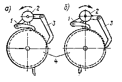 Храповые механизмы могут обеспечивать преобразование вращательного движения в колебательное или наоборот. На рис. 4 показана конструкция храпового механизма электрических часов, в которой толкающие собачки 1 и 3 преобразуют качания якоря 2 в прерывисто-вращательное движение храпового колеса 4. При движении якоря как в прямом, так и в противоположном направлениях собачки попеременно захватывают и толкают зубья храпового колеса (рис. 4, а, 6). На рис. 5 даны условные обозначения храповых механизмов для схем (ГОСТ 2.770—68): а — односторонний храповой механизм с наружным зацеплением; б — двусторонний храповой механизм с наружным зацеплением; в — односторонний храповой механизм с внутренним зацеплением.Кулисный механизм (рис. 6, а) наиболее часто применяют для преобразования вращательного движения кривошипа 1 в качательное движение кулисы 3. Камень кулисы 2 перемещается вдоль нее по направляющим. Кулисные механизмы могут быть использованы также для преобразования равномерного вращательного движения в неравномерное вращательное движение при а < r (рис. 6, б). Кулисы с камнем применяют также в тангенсных , синусных и других механизмах для замены высших кинематических пар низшими.