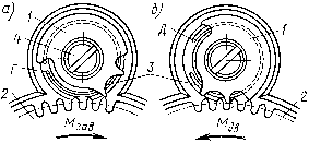 где [p]— допускаемое давление на единицу ширины зуба храпового колеса; определяется по справочнику; = b/т, b — ширина колеса.На рис. 3 показана конструкция храповика часового механизма. Вместо храпового колеса использовано обычное колесо с зубьями часового профиля. Это упростило конструкцию, так как сократилось число колес в механизме. Собачка 1 имеет несколько выступов и удерживается на оси винтом 4. На рис. 3, а показано положение собачки относительно колеса 2 при подзаводке часов. Момент М>зав> отводит собачку, которая одним из своих выступов непрерывно прижимается под действием пружины 3 к зубьям колеса 2, пропуская их. Выступ собачки захватил конец Д пружины 3, деформируя последнюю. Конец Г пружины закреплен неподвижно. На рис. 3, б показано стопорящее положение собачки, когда она удерживает колесо 2. Зуб колеса упирается в один из выступов собачки. При переходе из положения а в положение б храповое колесо немного поворачивается, благодаря чему ослабляется напряжение заводной пружины после ее тугого завода. Это способствует увеличению срока службы заводной пружины и стало возможным благодаря применению собачки с несколькими выступами.