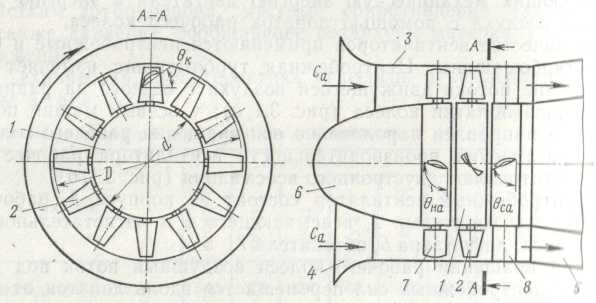 5 тель 6 снижает удары воздушного потока о лопатки; диффузор 5 преобразовывает динамический напор в статический. Для регулирования производительности и давления перед рабочим колесом устанавливают направляющий аппарат 7. Для раскручивания воздушного потока за рабочим колесом устанавливают спрямляющий аппарат 8, конструктивно представляющий собой неподвижное колесо с лопатками обтекаемой форм, устанавливаемыми под углом Оса.