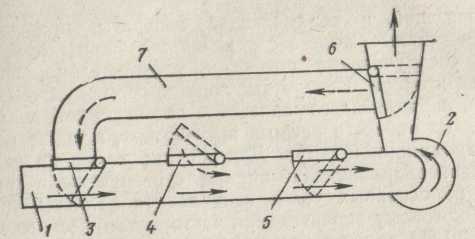При нормальной работе вентилятора воздух из шахты, как показано сплошными стрелками, поступает по вентиляционному каналу 1 к вентилятору