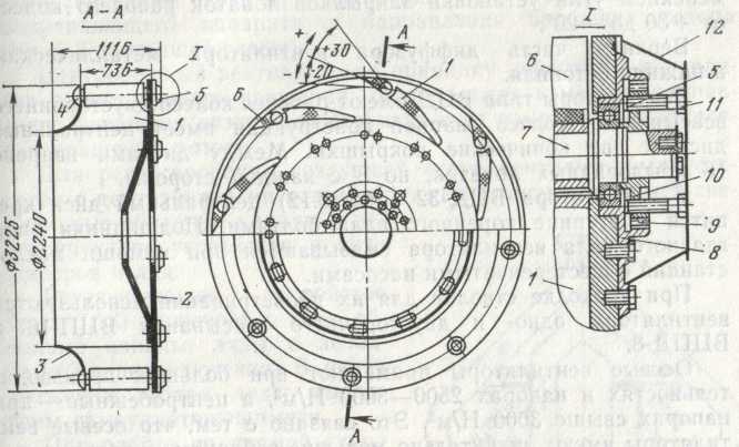 ной ванной для подшипников. Максимальная производительность вентилятора достигается при отрицательных углах установки лопаток, когда поток подкручивается навстречу вращению колеса. Режим работы регулируется изменением угла установки закрылков лопаток рабочего колеса.