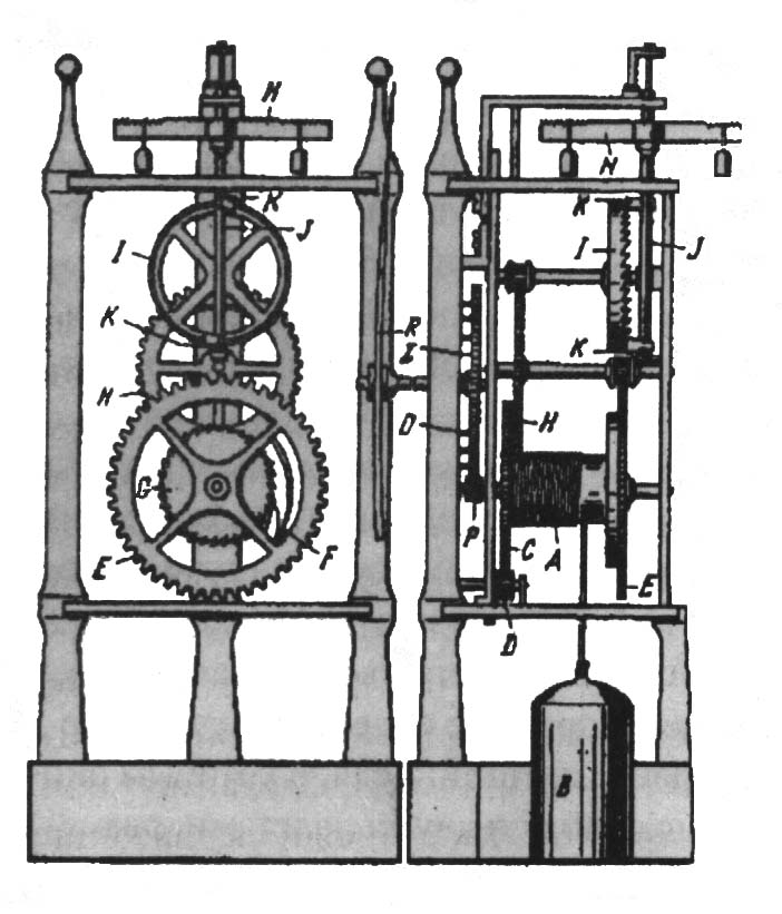Большое колесо приводило в движение шестерню, сидящую на оси, где находилось второе колесо - Н, а это последнее приводило в движение шестерню, находящуюся на оси, где сидело третье, или ходовое, колесо I. Шпиндельный спуск J с коромыслом N и палетами К действовал здесь так же, как описанный выше.
