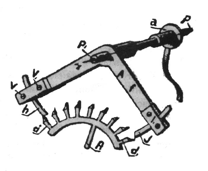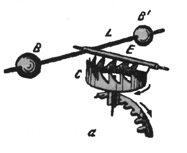Шпиндель был снабжен двумя палетами, размещенными на нем против нижнего и верхнего зуба коронного колеса. Палеты по отношению друг к другу располагались под углом 90 градусов и поочередно зацепляли зубцы коронного колеса, вызывая вращение шпинделя с палетами то в одну, то в другую сторону. Когда, например, выступающий зуб колеса сталкивался с нижней палетой и ударялся об нее, это приводило к вращению шпинделя на его оси и следовательно, к тому, что верхняя палета через некоторое время входила в промежуток между зубьями, находящимися в верхней части колеса. Давление, оказываемое верхним зубом, изменяло вращение шпинделя на обратное. Зуб ходового колеса при каждом таком повороте шпинделя освобождался. Но колесо сразу попадало в контакт с другой палетой, и так весь процесс повторялся снова. При каждом повороте шпинделя колесо успевало повернуться только на один зубец. Скорость поворота шпинделя определялась регулятором, который представлял собой, как уже говорилось, коромысло с передвигающимися по нему грузами. Если грузы перемещали ближе к оси, шпиндель начинал поворачиваться быстрее, и часы ускоряли свой ход. Если грузы перемещали ближе к краю - ход часов замедлялся.