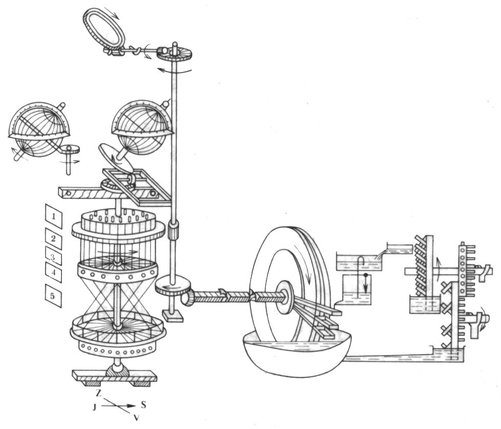 Эти часы имели сигнальное устройство времени, похожее на то, которое имелось у водяных часов Ктесибия. Астрономическая часть его часов имела форму армилярной сферы и небесного глобуса. Особенностью этих часов является большое водяное колесо с замкнутым кругооборотом воды, приводящее в движение часы в целом и являющееся некоторой аналогией механического спуска, появившегося позднее в Европе у первых механических часов.