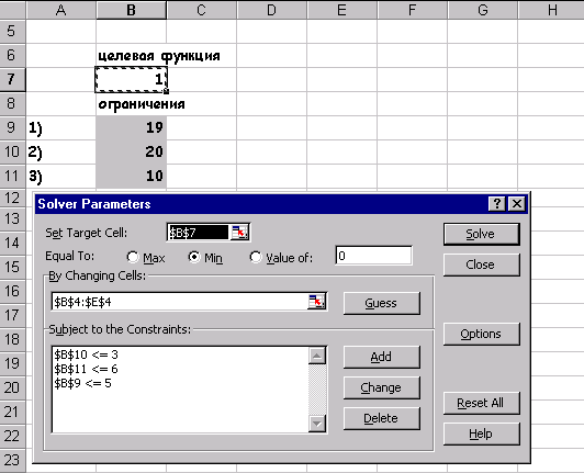 Рассмотрим предыдущую задачу, добавив условие поиска минимального значения на интервале [1;5]. Тогда диалоговое окно Поиск решения… следует видоизменить, добавив ограничения: