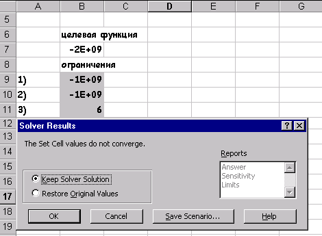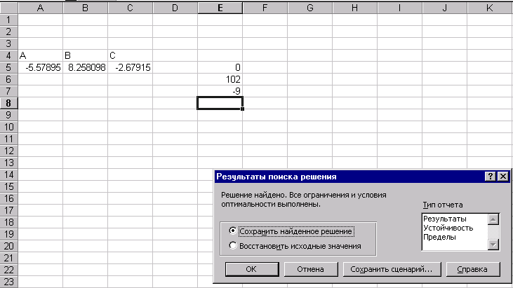 Если полученные значения следует "отразить на листе электронной таблицы, то надо щелкнуть на кнопке ОК . .если же нет то на кнопку Отмена. В первом случае найденные значения зафиксируются в клетках В5 и С5 и лист электронной таблицы будет выглядеть как на Рис.5, или как на Рис.6, если установить режим отображения результатов, предварительно сняв режим отображения формул, выполнив команду Сервис/Параметры/Вид/Формулы.