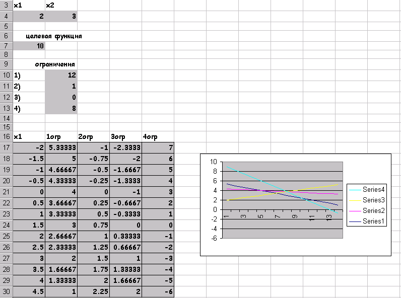 Как видим, при найденных значениях x>1>,x>2 >целевая функция принимает минимальное значение, равное –9.66 и этим удовлетворяются все ограничения поставленной задачи.