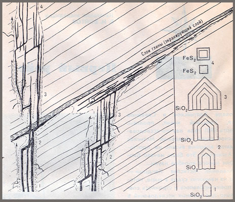 1, 2, 3, 4, - последовательные стадии роста минералов: кристаллов кварца и пирита. Рост кристаллов в недрах Земли оказывается связанным с 11-летним циклом солнечной активности.