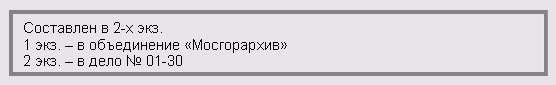 Если необходимо, оформляют отметку о наличии приложения (20). Если необходимо, оформляют рассылку акта, т.е. указывают количество составленных экземпляров и место их нахождения. Например: