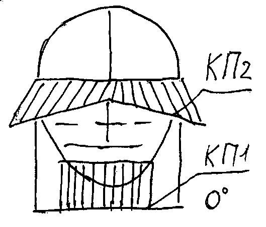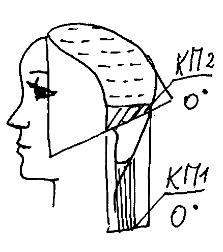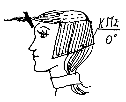 Внизу затылка отчесать горизонтальным пробором первую прядь и задать нужную длину, принять за контрольную прядь КП1 с оттяжкой 0º.