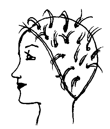 Челку также можно оформить в виде «рыбьего хвостика». Отчесав 1-2,5 см выше линии роста волос на виске от уха, надо лбом и следующий висок до уха. Прядь волос скрутить жгутиком на уровне бровей в центре лба и обрезать7. Получится полукруглая линия (форма челки может быть и другой в зависимости от внешности).