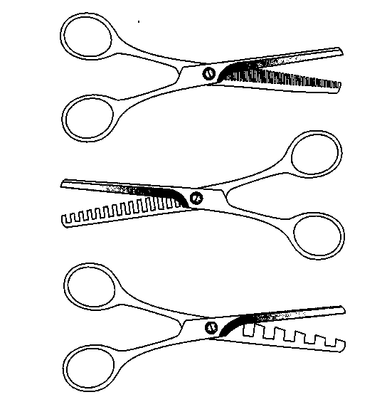 Филировочные ножницы применяются для выполнения филировки и тушевки волос. Они бывают двух видов: односторонние и двусторонние. Двусторонние филировочные ножницы имеют зубчики на двух рабочих полотнах, а односторонние — только на одном полотне (рис. 4). При работе филировочными ножницами волосы, попадающие между зубьями, остаются длинными, а волосы, попадающие на зубья, срезаются. Поэтому односторонние ножницы позволяют срезать больше волос, чем двусторонние.