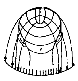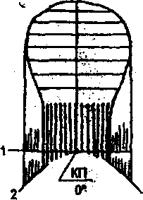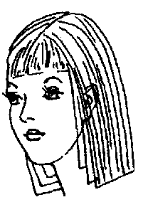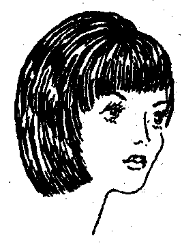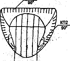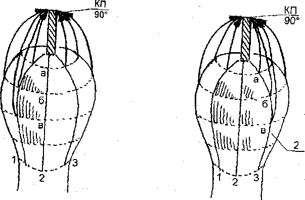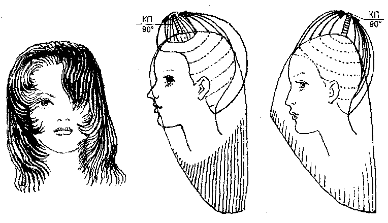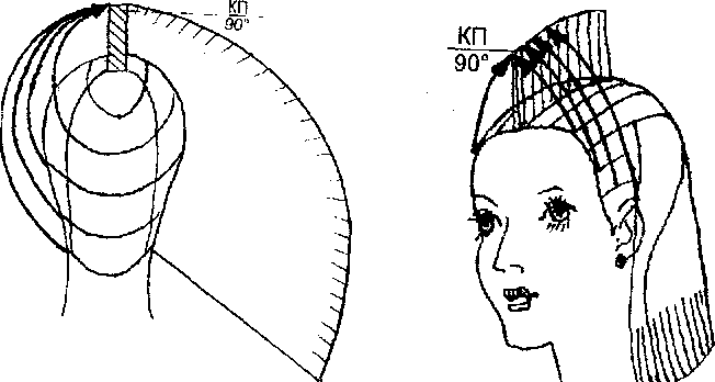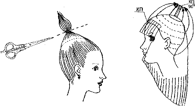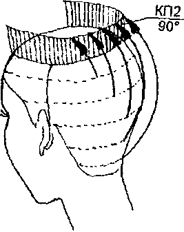 Теменная зона стрижется из волос равной длины с оттяжкой 90° 6-8 см по КП2 (рис. 2). Две-три пряди можно использовать для челки. Челку - КПЗ отделить горизонтальным пробором над лбом и задать нужную длину.