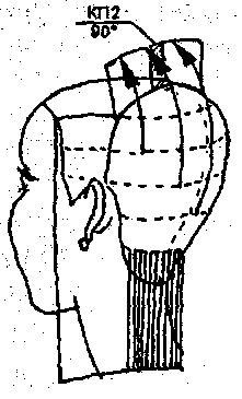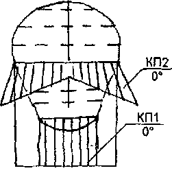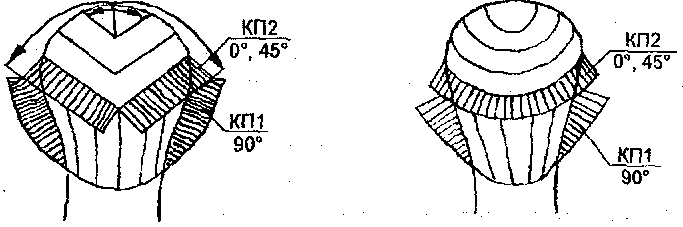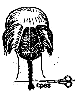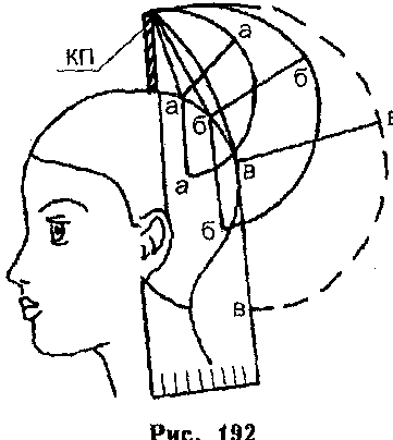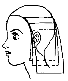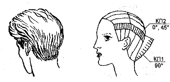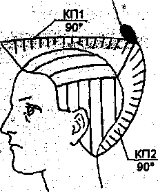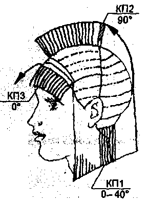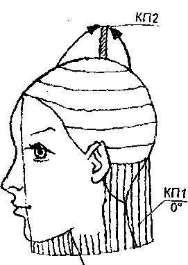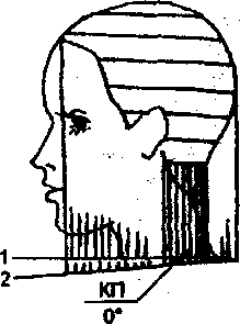 В нижнезатылочиой зоне горизонтальным пробором отделить и начесать на шею прядь с оттяжкой 0° (рис. 2). Выполнить прямую или вогнутую окантовку пряди, принять ее за контрольную прядь - КП1 с оттяжкой 0°. Стричь нижнезатылочную зону по КП1 с оттяжкой 0° методом наложения пряди на прядь по проборам через 1 см.