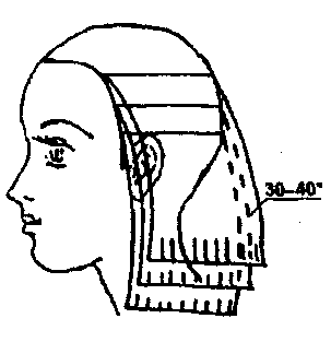 Среднюю и верхнюю затылочные зоны стричь с оттяжкой 30-40°. Для плавного перехода длины волос стричь по горизонтальным проборам через 1 см.