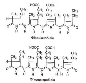 Як правило, в таких водоростях фікобіліни присутні в значно більшій концентрації порівняно з хлорофілами, тому саме вони і зумовлюють їхнє забарвлення. Фікоціаніни, фікоеритрини і алофікоціаніни трапляються в різних співвідношеннях, причому залежно від умов освітлення формується переважно такий набір пігментів, який найкраще використовує відповідний спектп.