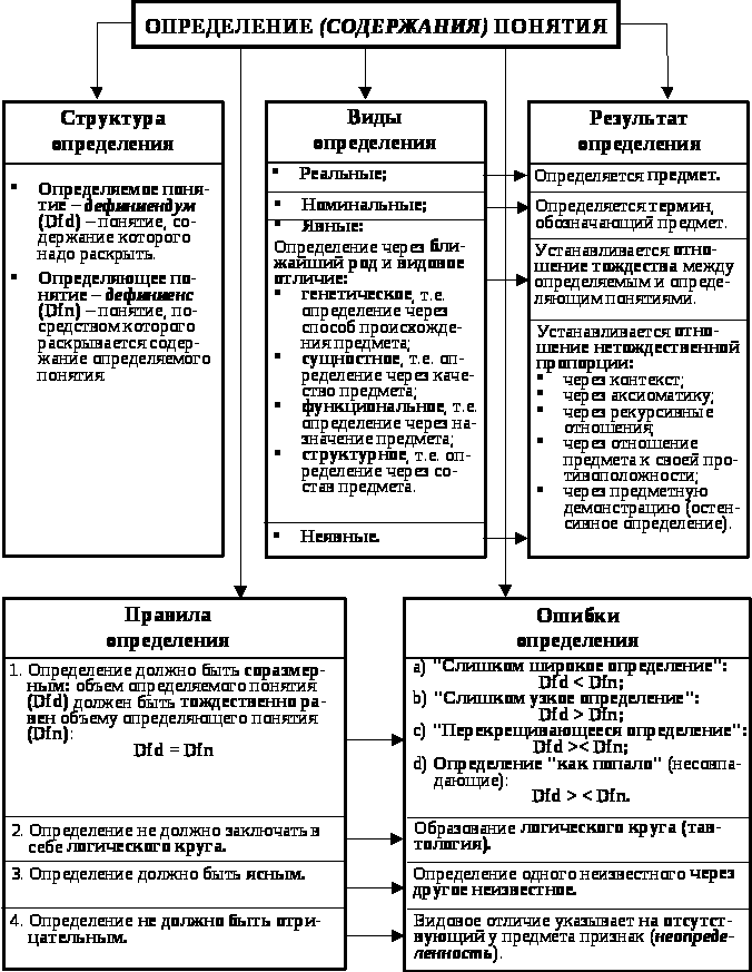 Наряду с раскрытием объема понятия существует необходимость и в раскрытии содержания понятия. Надо запомнить, что логическая операция, раскрывающая содержание понятия, называется определением понятия, или дефиницией понятия. Понятие, содержание которого требуется раскрыть, называется определяемым (или дефиниендумом), понятие же, с помощью которого раскрывается содержание определяемого понятия, называется определяющим (или дефиниенсом). Символически дефиниендум обозначается как Dfd, а дефиниенс – Dfn.
