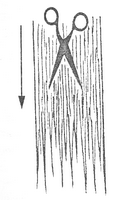 Прядь для стрижки отделяется тщательными ровными проборами с расстоянием между ними 1 см, прядь тщательно расчесывается и только потом отстригается. Прядь зажимается между средним и указательным пальцами левой руки, оттягивается на себя. Срез ножницами делается или внутри, или снаружи ладони; это зависит от длины волос, от зоны головы, и просто от того, как вам удобнее. Концы ножниц не должны заходить за средние фаланги пальцев иначе можно повредить руку.