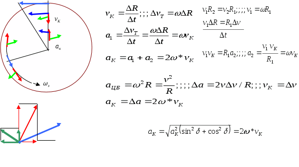 Задание : сформулируйте пять выводов из приведённого ниже кинематического доказательства формулы силы Кариолиса. Здесь использованы: законы сохранения импульса и сохранения момента импульса, правило сложения векторов и теорема Пифагора, правила интерпозиции и взаимной независимости действия фмзических законов.