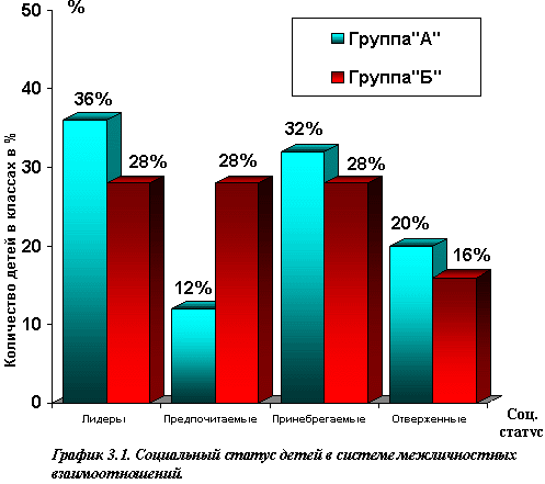 третью статусную категорию (принебрегаемые) имеют 50 % девочек в экспериментальной группе “А” и 23 % в экспериментальной группе “Б”;