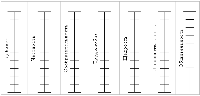 Методика предполагает следующую процедуру проведения: Ребенку предлагается ряд шкал, условно обозначающих проявление различных черт личности, и следующая инструкция: "Допустим, что на этой линии расположились все люди мира в порядке повышения их состояния здоровья (пример со шкалой здоровья): внизу – самые больные люди, вверху – самые здоровые (те, которые никогда не болеют). Как ты думаешь, где твое место среди всех людей мира по состоянию здоровья?".