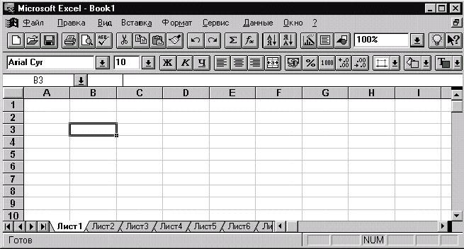 Электронная таблица в Excel имеет трехмерную структуру. Она состоит из листов, как книга (таких листов 16). На экране виден только один лист - верхний. Нижняя часть листа содержит ярлычки других листов. Щелкая кнопкой мыши на ярлычках листов, можно перейти к другому листу.