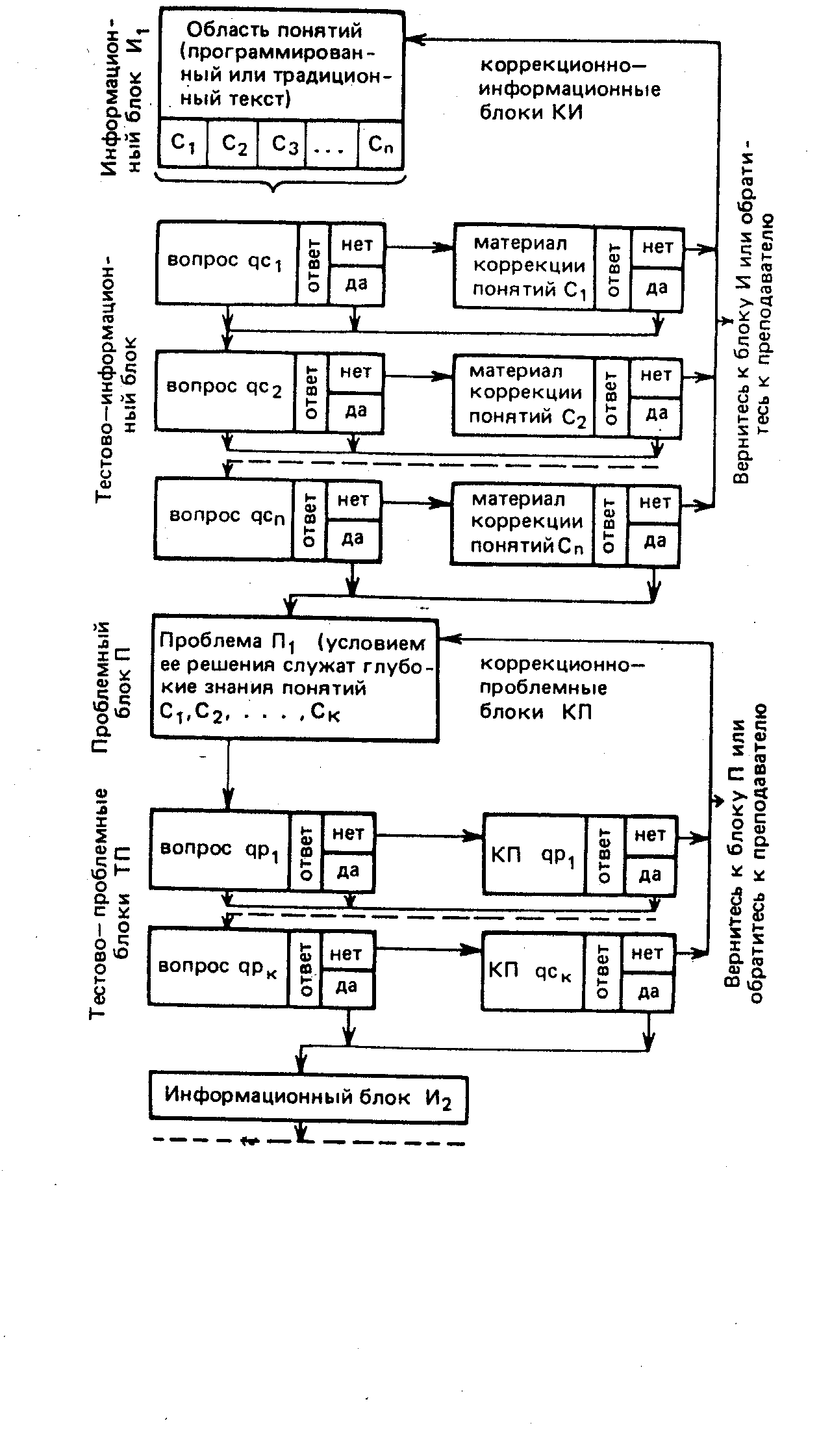 Задача блока ТИ состоит в том, чтобы проверить степень овладения учащимся всеми областями понятий, которые используются в блоке И, и направить его в соответствии с полученными результатами к блоку П или к блоку КИ. К блоку /7 учащийся переходит только тогда, когда хорошо овладеет материалом, помещенным в блоке И. Если он не овладел тем или другим понятием из С1, С2, С3, С4, ..., Сn, то ему следует перейти к соответ- ствующему корректирующему блоку, в рамках которого он пополнит свои знания в областях, которые этого требуют и которые были выявлены в результате теста в блоке ТИ.