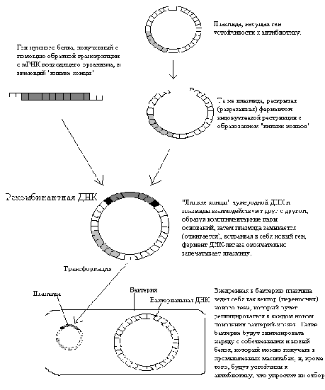 Основная масса исследований, которые привели к развитию генной инженерии, проводилась на классическом объекте микробиологов – кишечной палочке Escherichia coli. С помощью специальных ферментов – эндонуклеаз рестрикции, или рестриктаз, плазмида, несущая какой-нибудь маркерный ген, например, ген устойчивости к определенному антибиотику, разрезается в строго определенном месте с образованием с каждой стороны нескольких (от одного до пяти) неспаренных оснований – «липких концов». С помощью таких же рестриктаз получается фрагмент генома организма-донора, несущий нужный ген, например, ген человеческого инсулина. В последнее время донорную ДНК чаще получают путем «пришивания» «липких концов» к молекуле ДНК, полученной путем обратной транскрипции с матричной РНК нужного гена (кДНК). Главную роль здесь играет фермент обратная транскриптаза, или ревертаза, впервые открытая у ретровирусов (таких как ВИЧ и некоторые возбудители злокачественных новообразований – онковирусов). Далее за счет комплиментарного взаимодействия неспаренных оснований «липких концов» происходит включение нужного гена в плазмиду, при этом образуется новая рекомбинантная (гибридная) ДНК. Завершает процесс фермент ДНК-лигаза, которая ковалентно зашивает разрывы в цепях ДНК.
