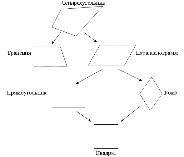 В методическом смысле полезными в обучении математике могут оказаться и схемы, на которых изображена зависимость изучаемых объектов. Например, в курсе планиметрии рассмотрим класс четурехугольников (рис. 4):