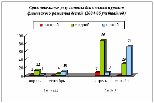 Так, из представленной диаграммы видна положительная динамика в состоянии физического развития детей выделенной группы: (соответственно данные за СЕНТЯБРЬ И АПРЕЛЬ, 2004-05 уч.года) изменились показатели высокого уровня физического развития, он вырос с 0 до 7% (1 человек), среднего уровня – с 29% (4 человека) до 86% (12 человек), показатель низкого уровня снизился с 71% (10 человек) до 7% (1 человека).