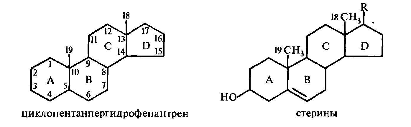 Большой класс стероидов характеризуется наличием в молекуле специфического циклического скелета — циклопентанпергидрофенантрена, построенного из четырех колец, три из которых шестичленные (А, В и С) и одно — пятичленное (D). Для обозначения различных положений этого кольца принята следующая нумерация. К стеринам (стеролам) относятся стероиды, несущие в положении С-3 гидроксильную группу: