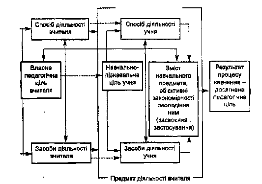 У процесі навчання об’єктом діяльності учителя (суб’єкта) є учень, клас, а предметом - навчально-пізнавальна діяльність (учіння) кожного школяра. Власне педагогічною метою діяльності вчителя є всебічний розвиток особистості учня, що досягається тільки в результаті навчально-пізнавальної діяльності дитини. Так, скільки учитель не розповідав би матеріал, але якщо учень не слухає, не мислить, не запам’ятовує і вольовими зусиллями не зосереджує увагу і т. ін., він не оволодіє цим змістом, не розвиватимуться його мислення, пам’ять, почуття, ставлення до навколишнього світу [6].