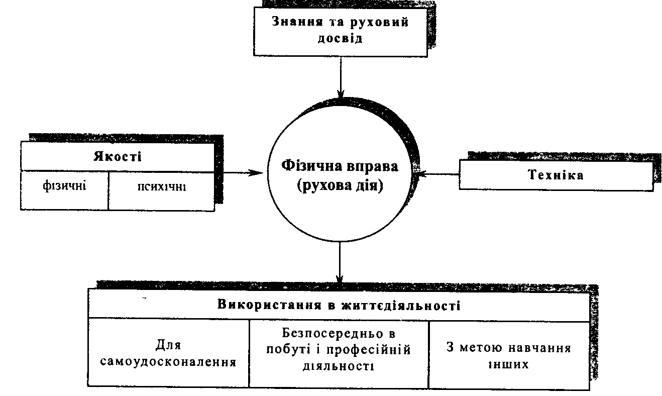 При всій специфічності окремих розділів шкільної програми різних освітніх рівнів в основі абсолютної більшості занять з фізичної культури лежить вивчення фізичних вправ з метою збагачення рухового досвіду учнів, необхідного для успішної життєдіяльності. Суть вивчення рухових дій у всіх розділах програми однакова і може бути представлена схематично.