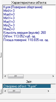 Створюємо кулю з вказаними параметрами і у вікні з інформацією про об’єкту отримуємо дані про об’єм кулі (рис. 33) і перемножуємо на густину скла. В результаті отримуємо співпадання даних, добутих двома способами.