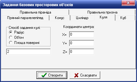 Викликаємо команду «Створити базовий просторовий об'єкт». У вікні, що появилось, вибираємо вкладку «Куля» (рис. 29).